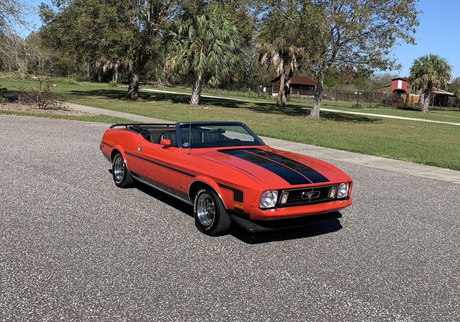 We are pleased to offer this 1973 Ford Mustang Convertible,with its numbers-matching 302 V8 and C4 automatic transmission. Equipped with power steering, power disc brakes, and 14” Magnum 500 wheels with Cooper white letter tires, this Mustang delivers both style and drivability. Finished in bright red with a black stripe package, rear deck spoiler, and black power convertible top with boot, it has a true muscle car presence. The interior features black knitted vinyl bucket seats, floor shifter, and AM/FM/Cassette radio, along with the original owner’s manual. A clean, well-kept classic Mustang, ready to cruise and enjoy.