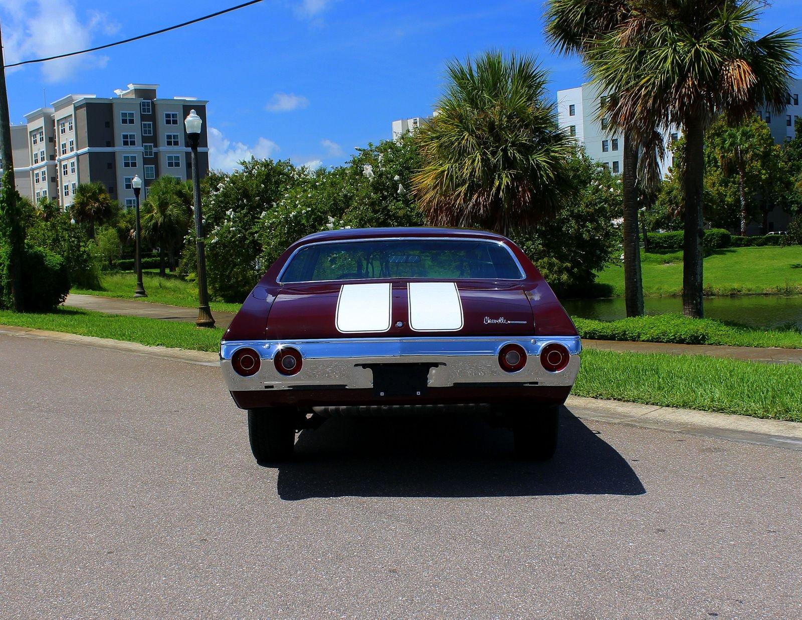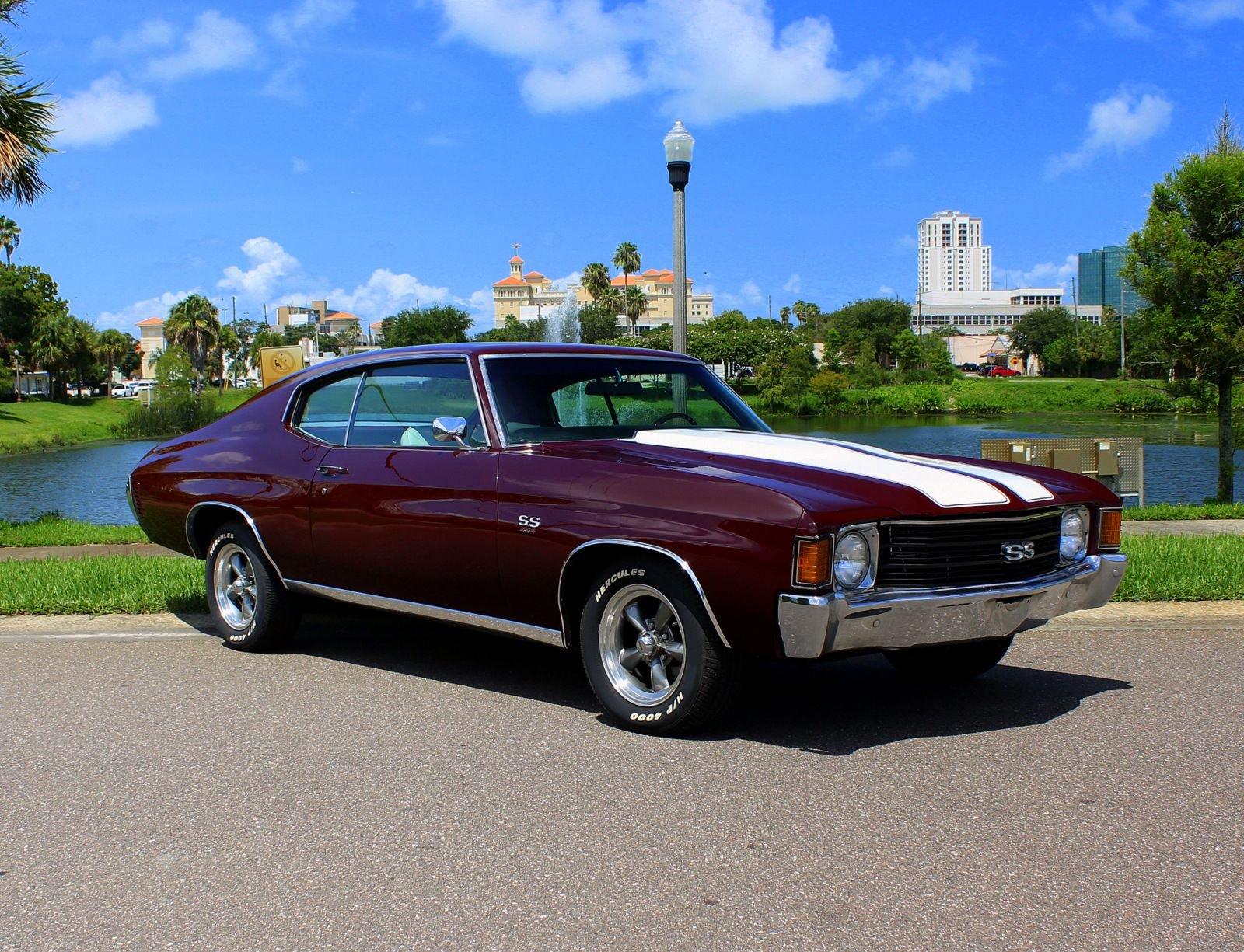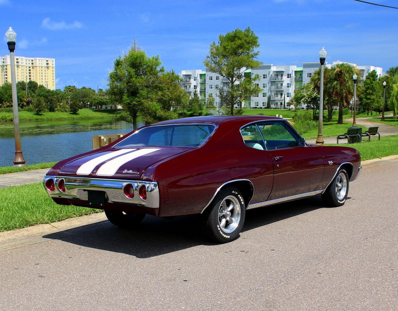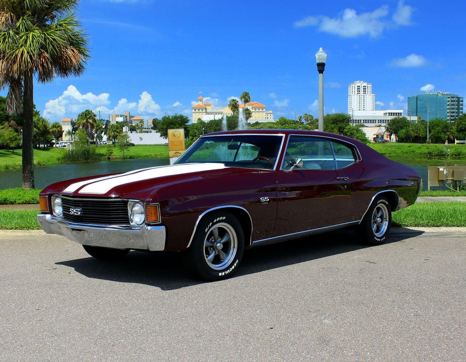 1972 Chevy Chevelle for Sale. Powered by a 454 CI V8 with an Edelbrock Intake, 4 barrel carb, and headers into throaty dual exhaust that create the unmistakable sound of a BIG BLOCK Chevy! It's backed by an automatic transmission, power steering, power disc brakes, and Vintage Air Conditioning. Neat and detailed engine compartment. The contrasting white bucket seat interior, center console, tilt steering column, and wood grain steering wheel all add to the car's appeal. A bold SS stripe package along with badging will turn heads as you rumble past! The car rolls on a set of silver gray metallic alloy 5 spoke rims carrying Hercules HP 4000 raised white letter radials in 215/65R 15's. Chevelles are one of the most popular Classic Cars right now! This Big Block Chevy will provide countless hours of cruising and will be a hit at any car show it attends!