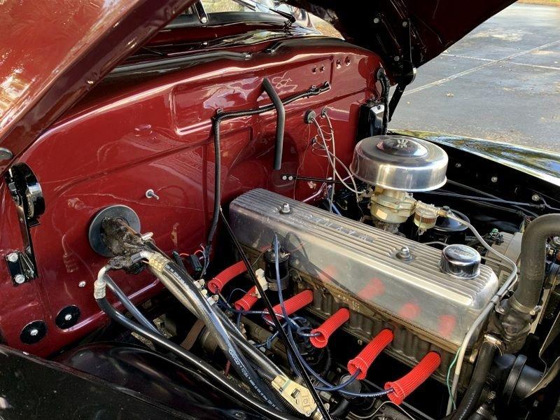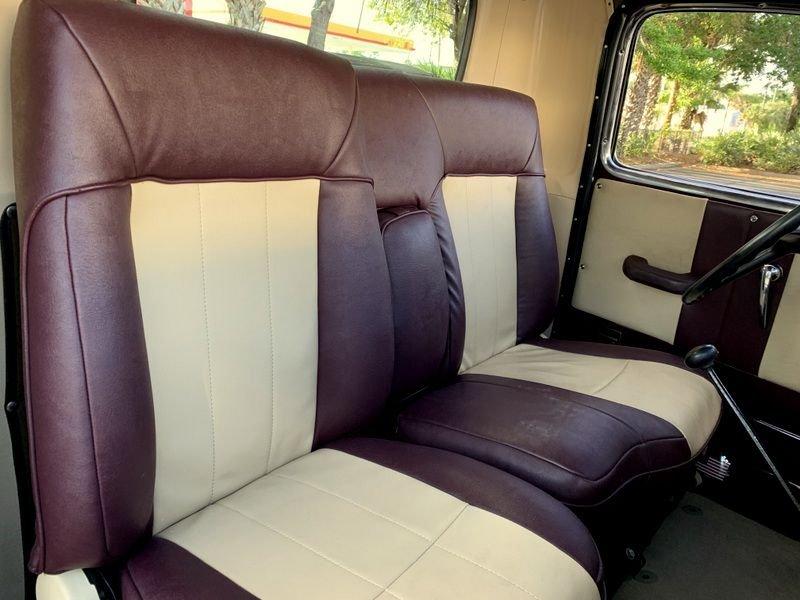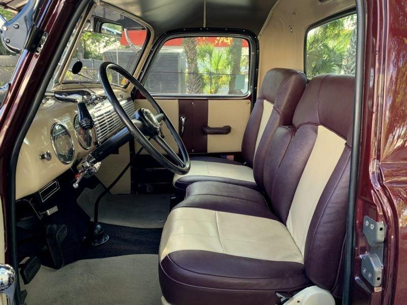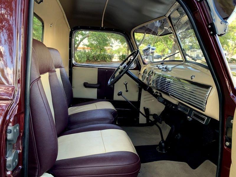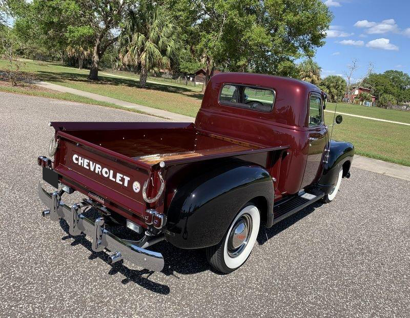 We are pleased to offer this 1948 Chevrolet 3100 Pickup for Sale. Powered by an Inline 6 cylinder engine, Fenton split exhaust manifold with dual exhaust, remote oil filter, electronic ignition, 12 volt electrical system with a Delco Alternator, updated wiring, floor shifter, 4 speed manual transmission with granny style first gear, 16” painted steel wheels with caps, pie crust style wide white wall tires, wood bed with stainless steel trim, beautiful jet black fenders with Brandy Wine body, windshield visor, halogen headlights with light visors, upgraded turn signals and exterior lighting, working fog lights, split front windshield, replacement glass, dual cowl mount mirrors and door frame mirrors, vinyl split bench seat interior, stock steering column, painted dash, air conditioning, working factory style gauges, upgraded AM/FM/Cassette radio, upgraded electronic wipers.