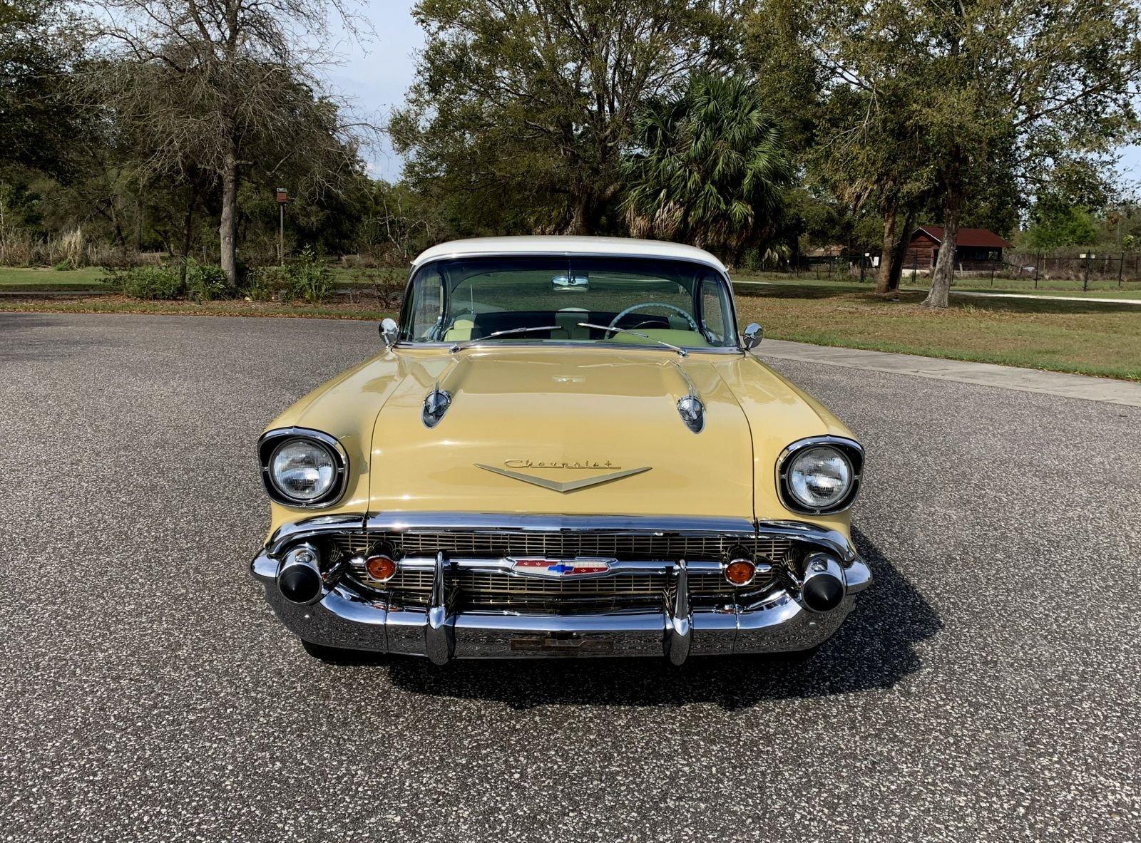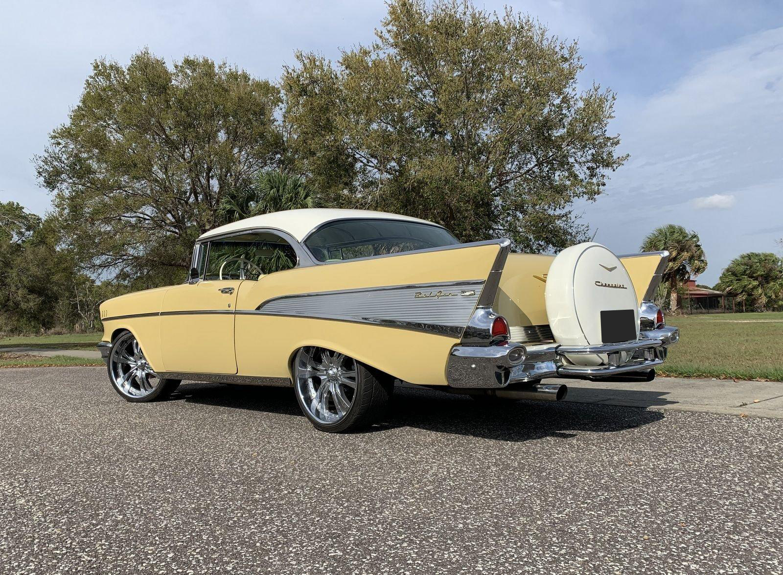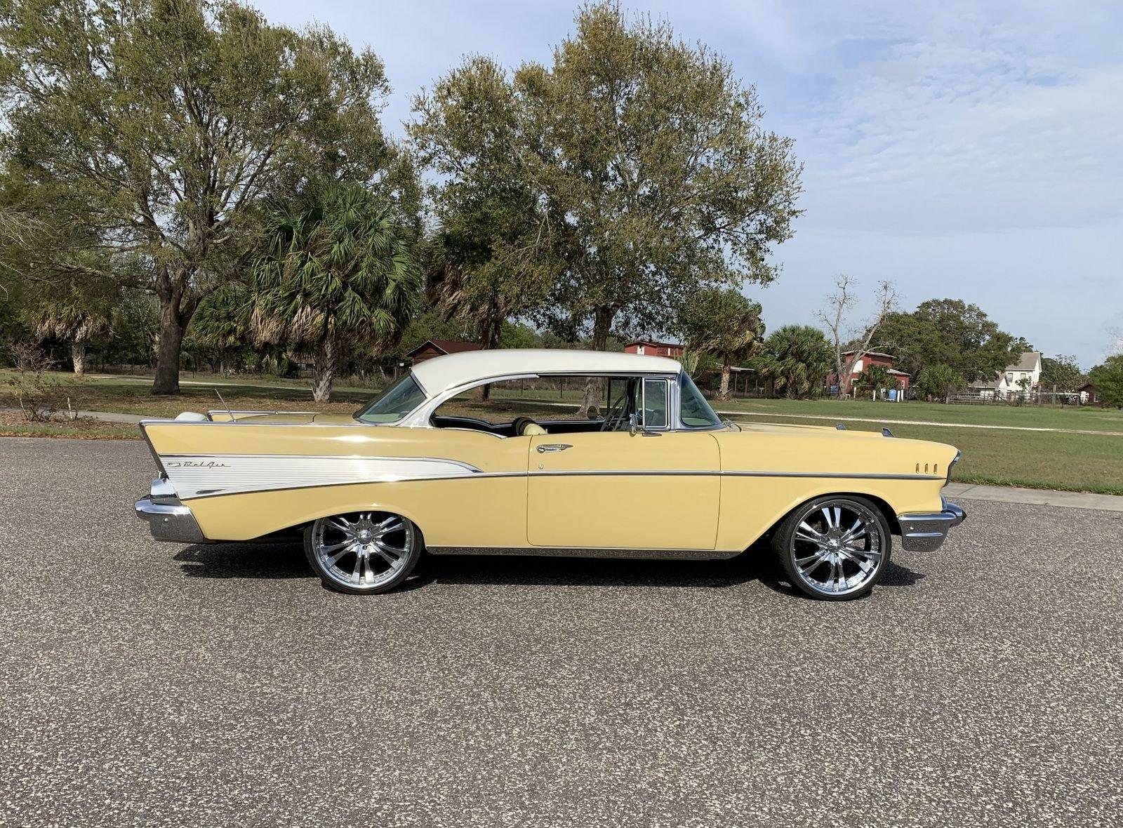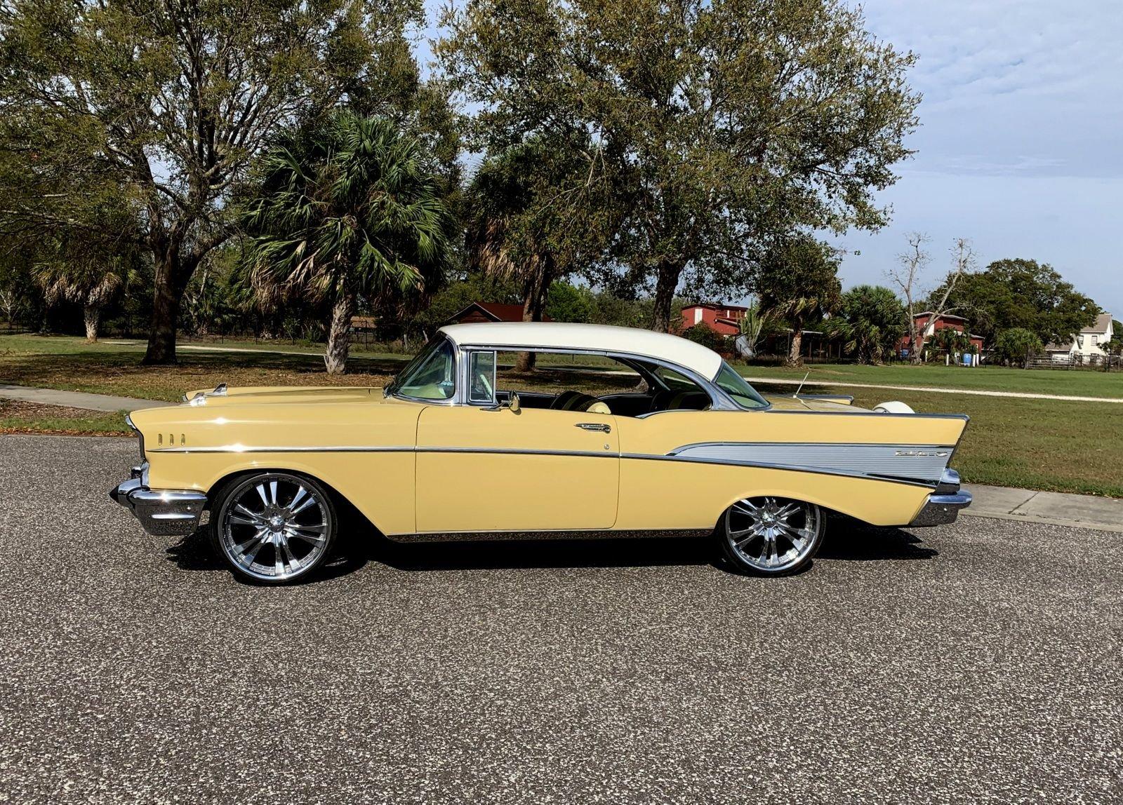 We are pleased to offer this 1957 Chevrolet Bel Air Hardtop for Sale. 350 Cu In V8 engine block, 4 barrel carburetor, chrome engine accessories, dual exhaust, automatic transmission, air conditioning, power disc brakes, power steering, 20” chrome plated alloy wheels, eye catching two tone paint, dual chrome sport mirrors, factory style bench seat interior, floor shifter, GPS speedometer, auxiliary gauges, upgraded radio.