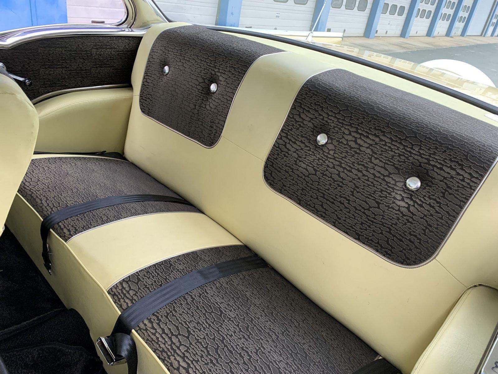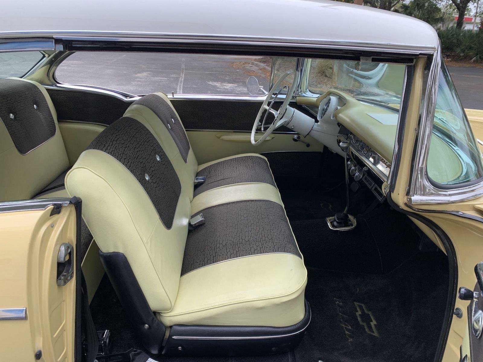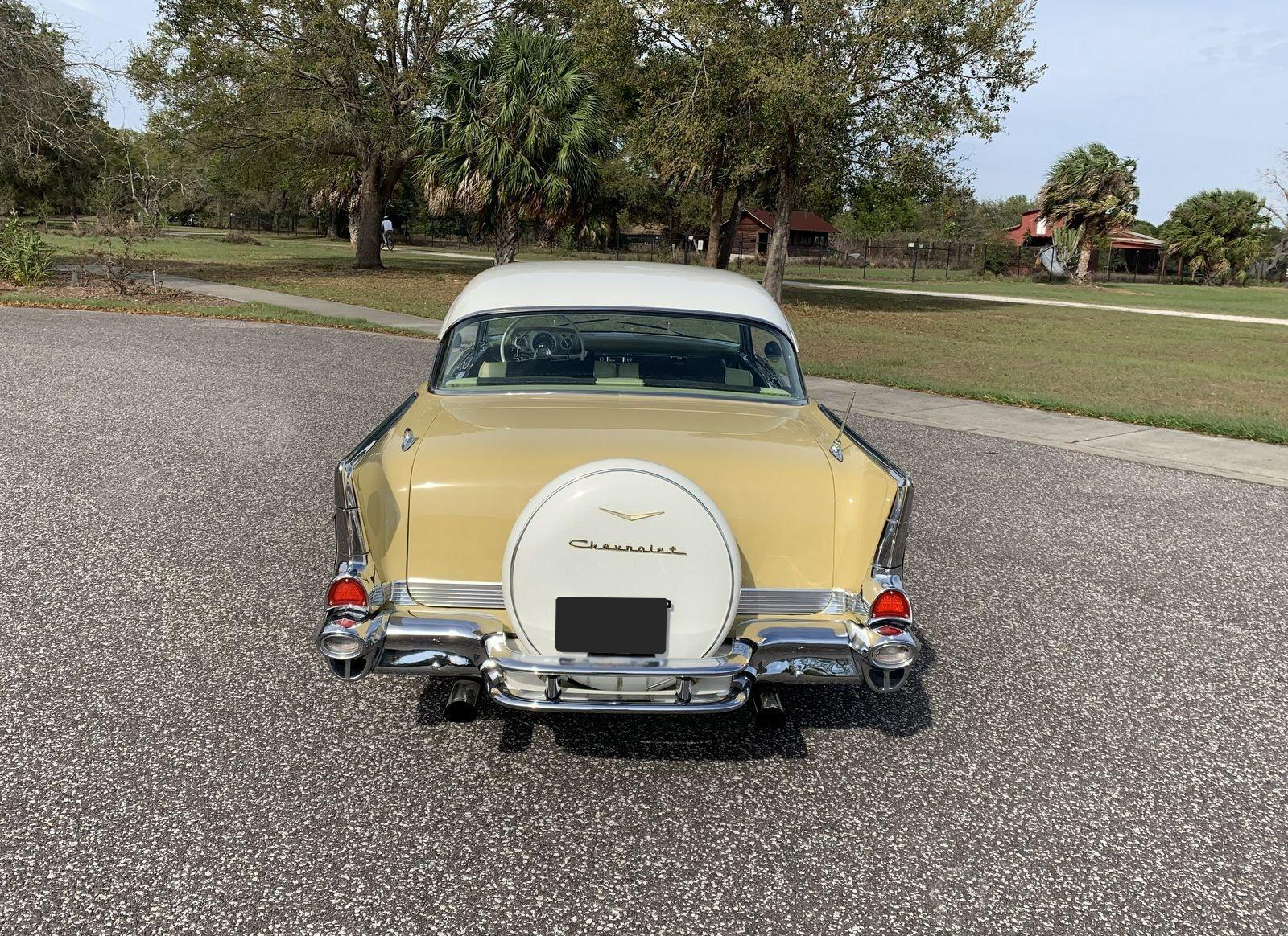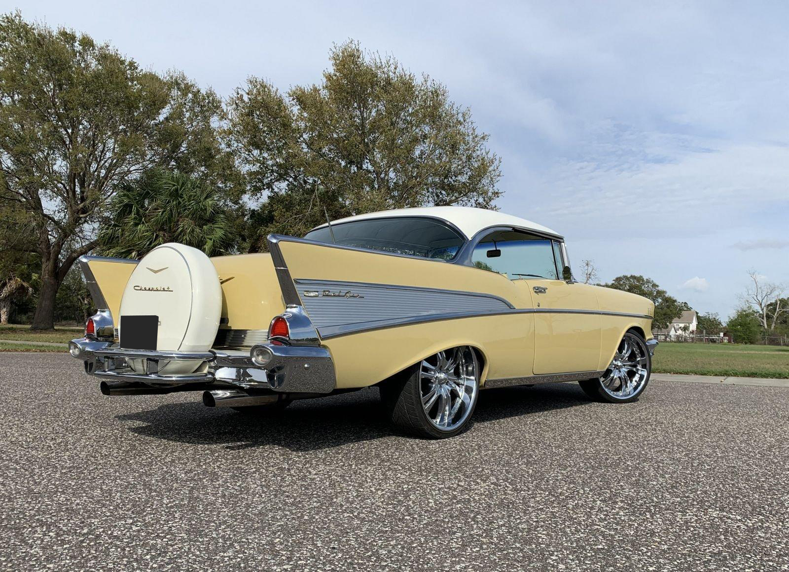 We are pleased to offer this 1957 Chevrolet Bel Air Hardtop for Sale. 350 Cu In V8 engine block, 4 barrel carburetor, chrome engine accessories, dual exhaust, automatic transmission, air conditioning, power disc brakes, power steering, 20” chrome plated alloy wheels, eye catching two tone paint, dual chrome sport mirrors, factory style bench seat interior, floor shifter, GPS speedometer, auxiliary gauges, upgraded radio.