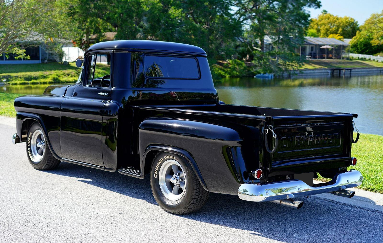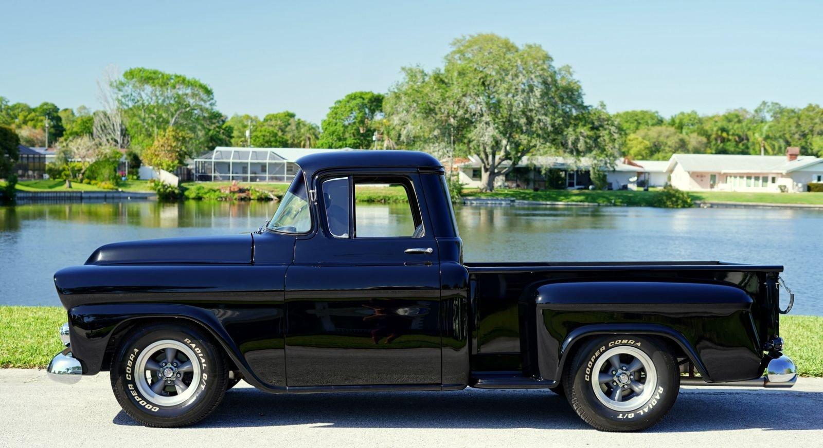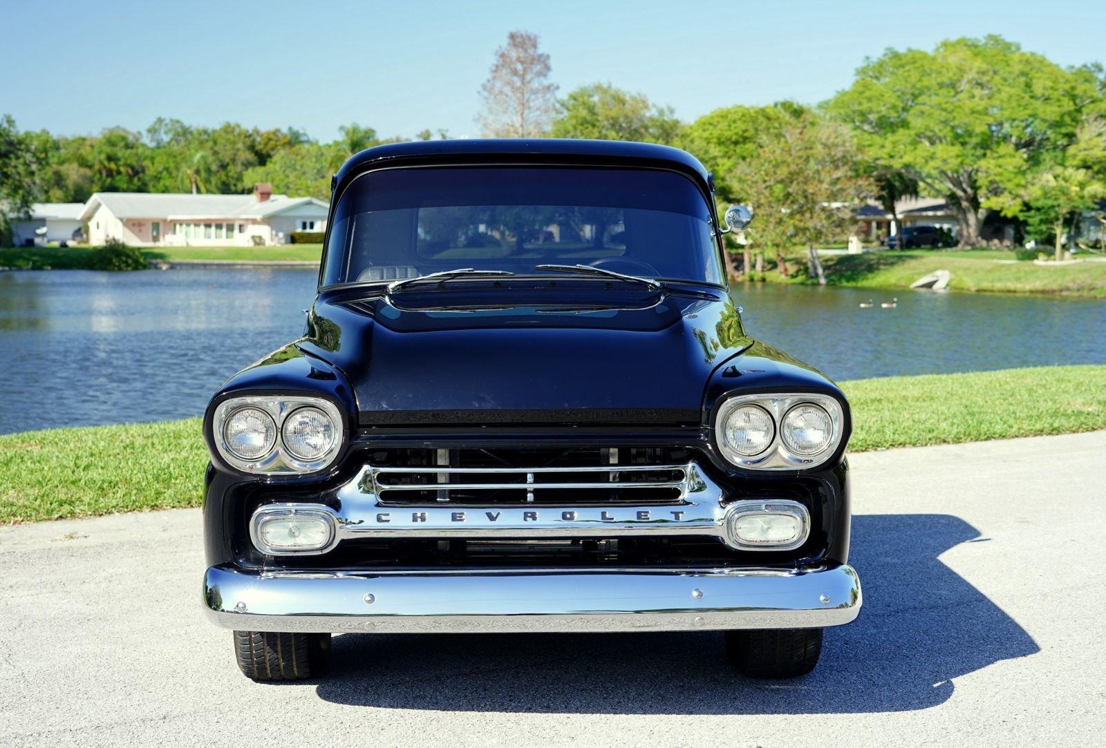 We are pleased to offer this 1958 Chevrolet Apache Pickup Truck for Sale. 350 Cu In V8 engine, Demon 4 barrel carburetor, air gap aluminum intake, electronic ignition, dual exhaust with electric cutouts, 700R4 overdrive transmission, upgraded front suspension with rack and pinion power steering, 4 wheel disc brakes, 9 inch rear with a 3.00 posi gear, 15” American Racing Torque Thrust D Wheels with Cooper white letter tires, stunning jet black paint job on an incredibly strait Pickup Body, step side bed, wood bed floor, driver's chrome mirror, tinted glass, black bench seat interior, tilt steering column, VDO Gauges, Lokar Shifter, under dash air conditioning, electric wipers.