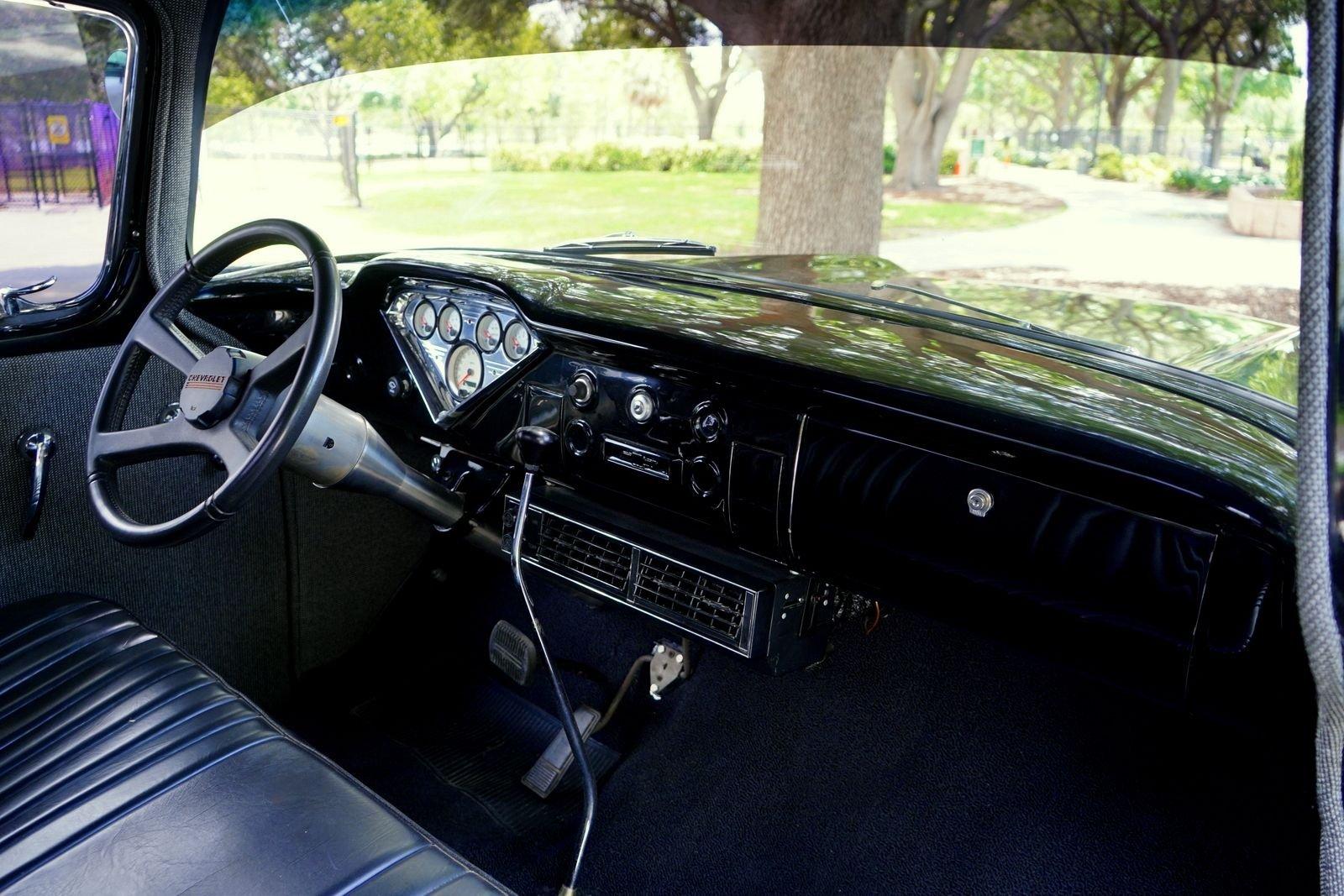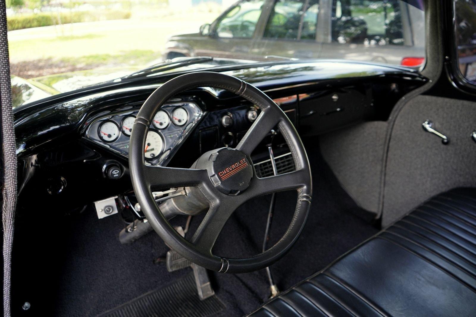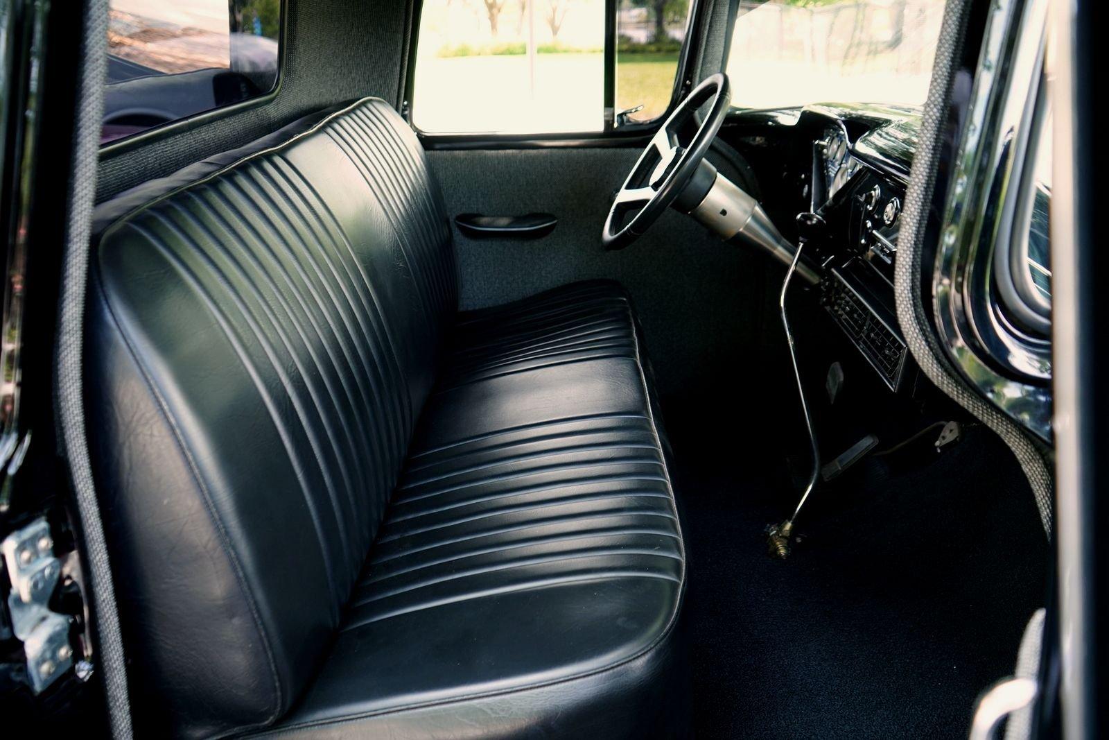 We are pleased to offer this 1958 Chevrolet Apache Pickup Truck for Sale. 350 Cu In V8 engine, Demon 4 barrel carburetor, air gap aluminum intake, electronic ignition, dual exhaust with electric cutouts, 700R4 overdrive transmission, upgraded front suspension with rack and pinion power steering, 4 wheel disc brakes, 9 inch rear with a 3.00 posi gear, 15” American Racing Torque Thrust D Wheels with Cooper white letter tires, stunning jet black paint job on an incredibly strait Pickup Body, step side bed, wood bed floor, driver's chrome mirror, tinted glass, black bench seat interior, tilt steering column, VDO Gauges, Lokar Shifter, under dash air conditioning, electric wipers.