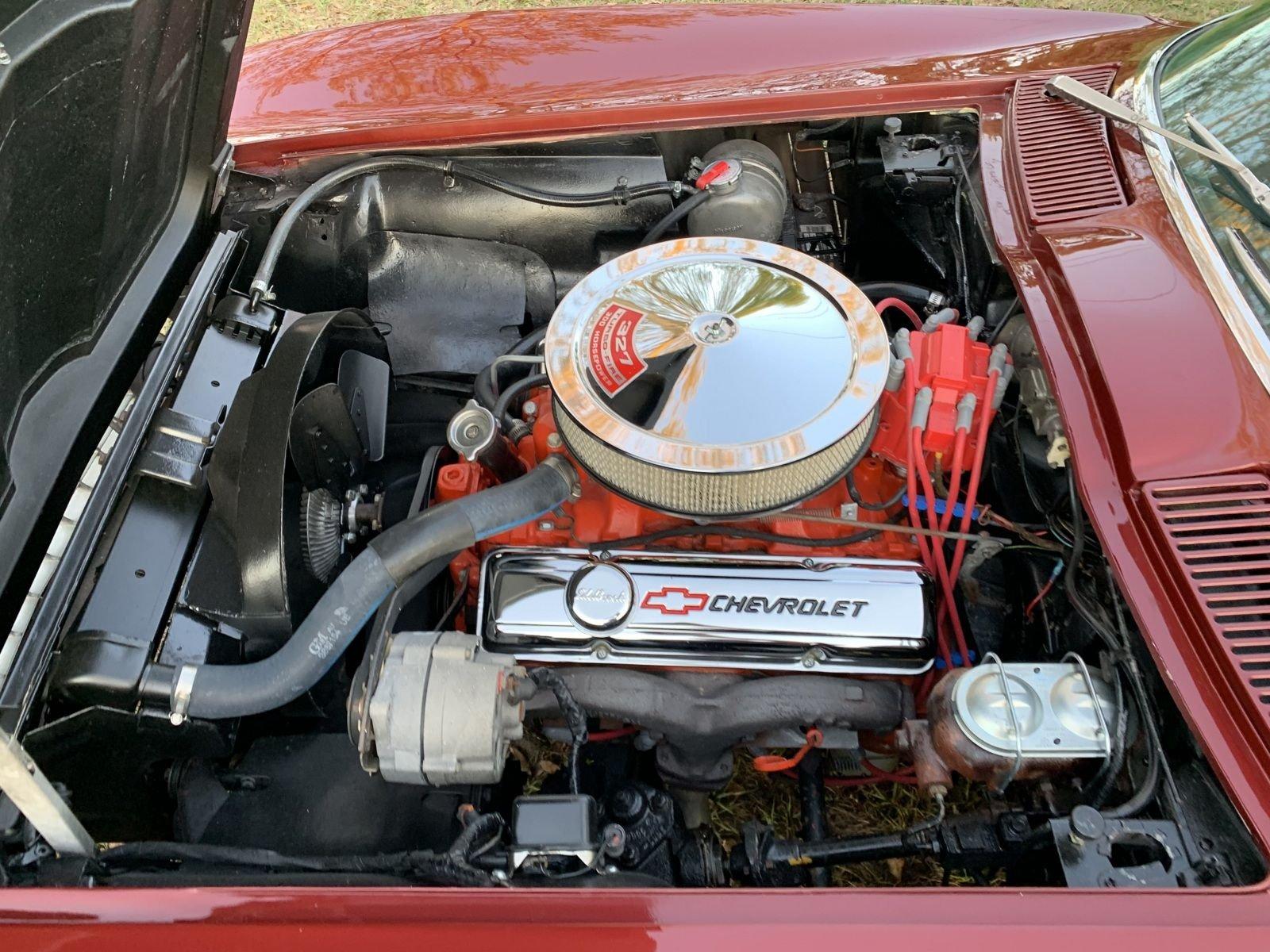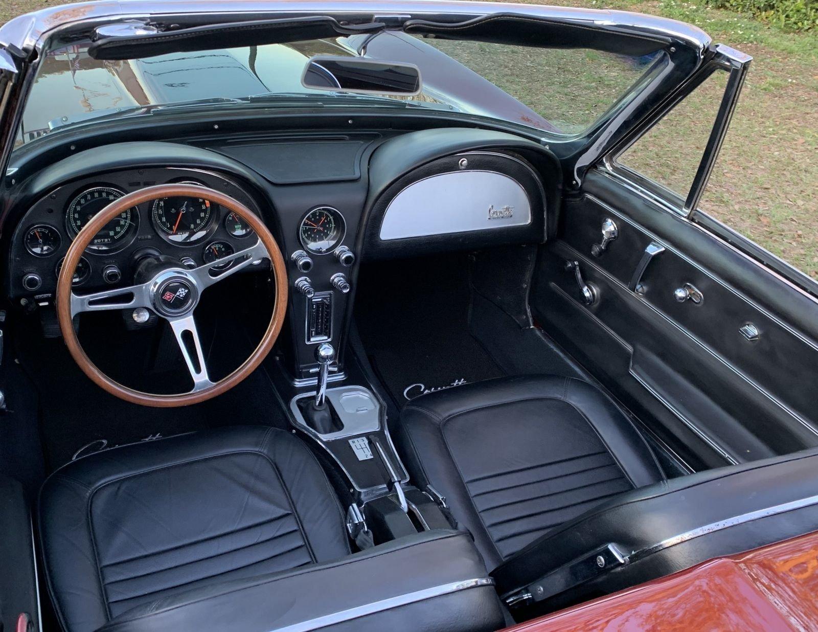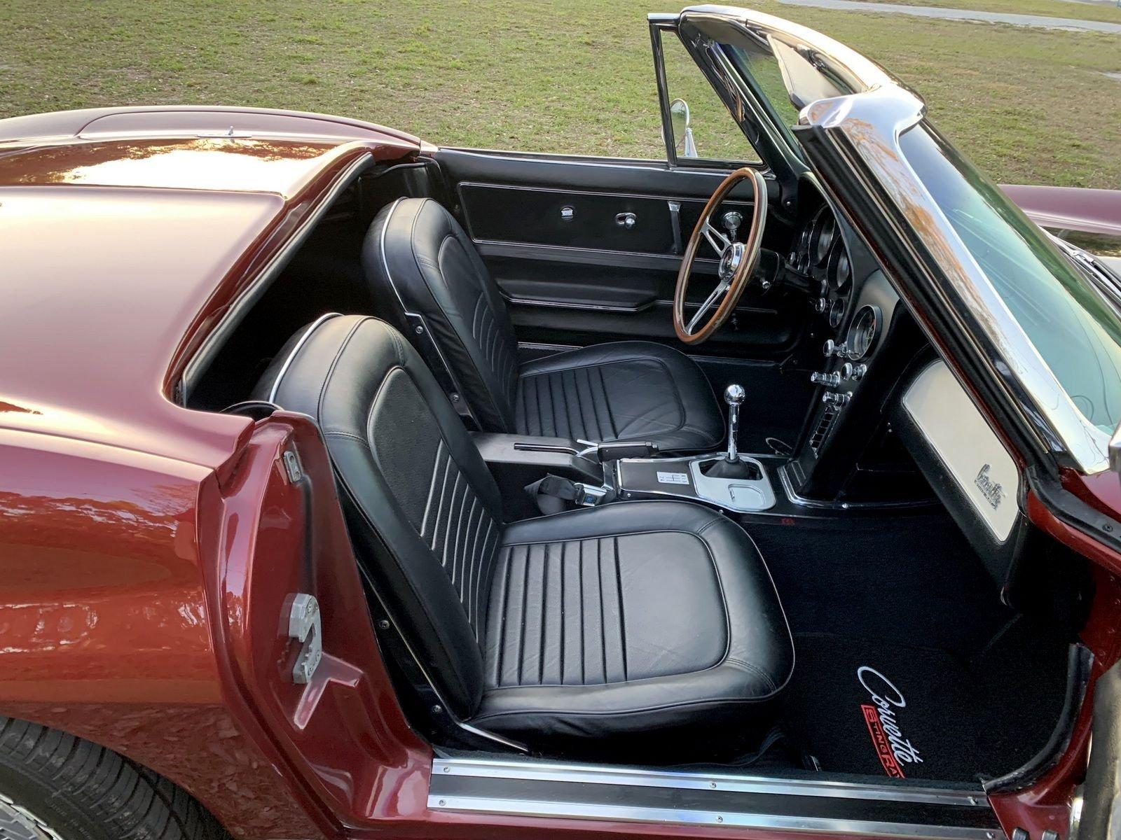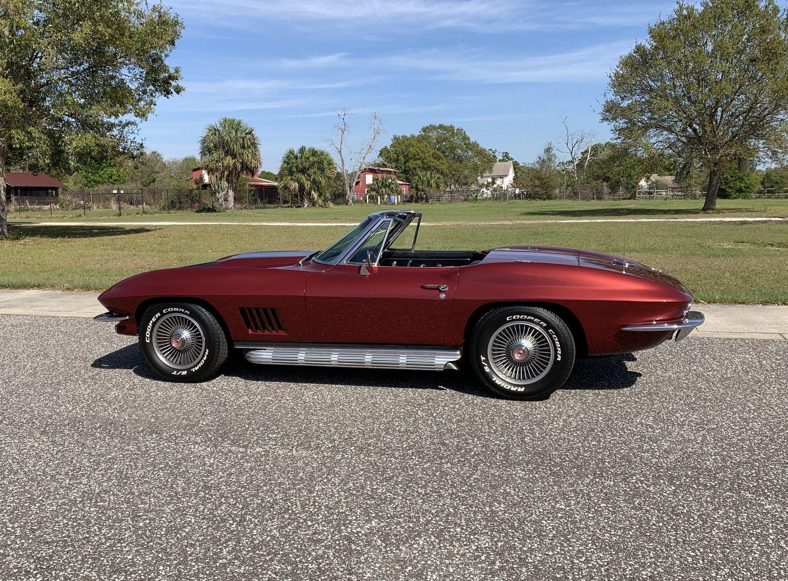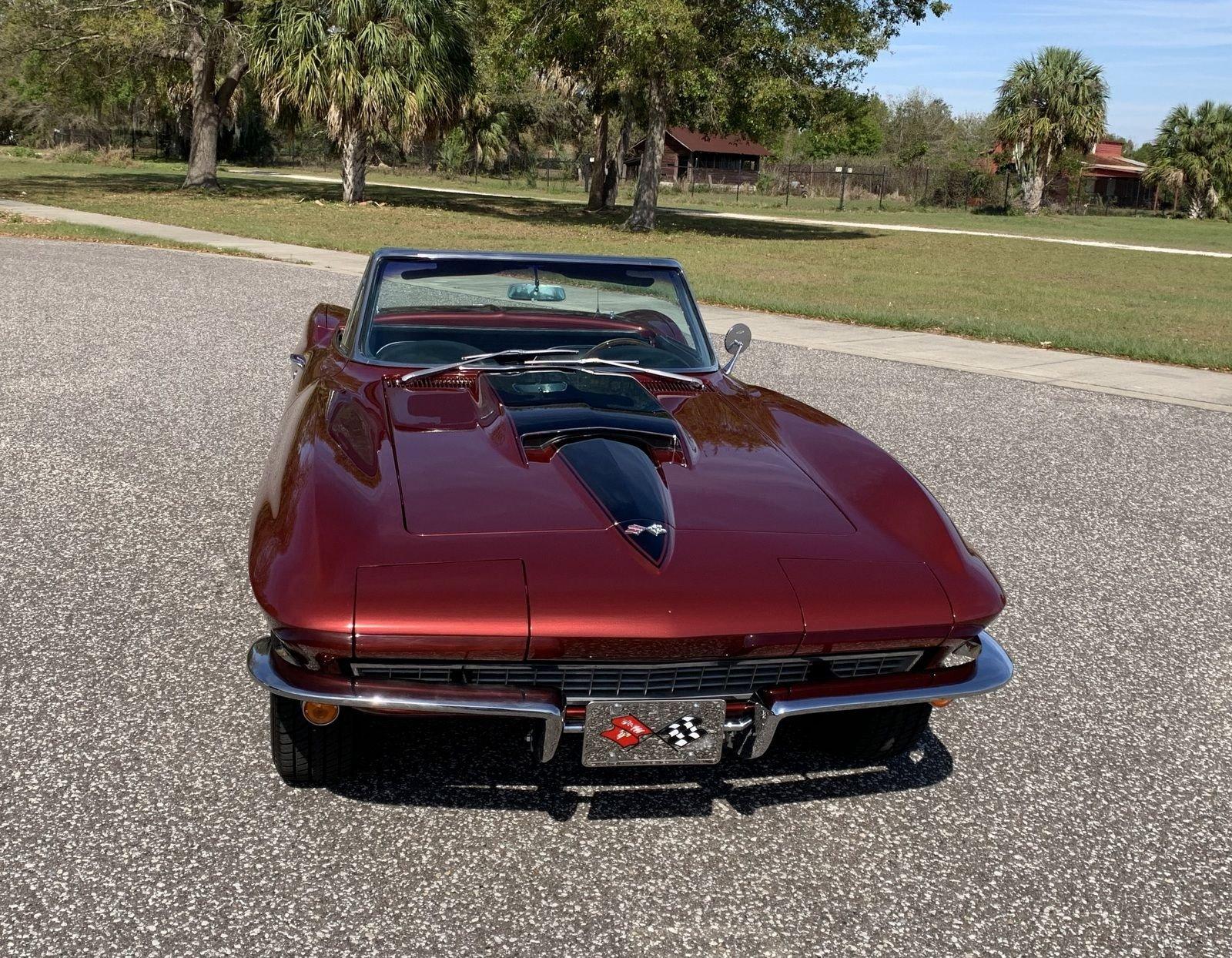 We are pleased to offer this 1967 Chevrolet Corvette Roadster for Sale. 327 HC Suffix Code engine block rated at 300 horsepower, Holley 4 barrel carburetor, HEI electronic ignition, side exhaust, numbers matching Muncie 4 speed manual transmission, 4 wheel disc brakes, 15” bolt on alloy wheels, Cooper white letter radial tires, refinished in Milano Maroon metallic, Stinger Hood with stripe package, working electric headlights, driver's chrome sport mirror, black convertible top, black bucket seat interior, 3 spoke wood trim steering wheel, beautiful gauge package, updated AM/FM radio.
